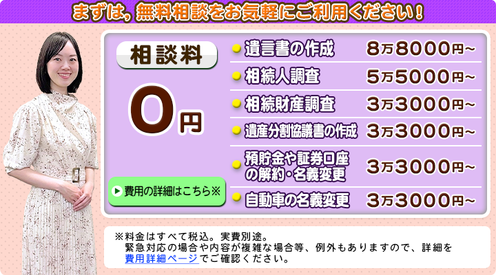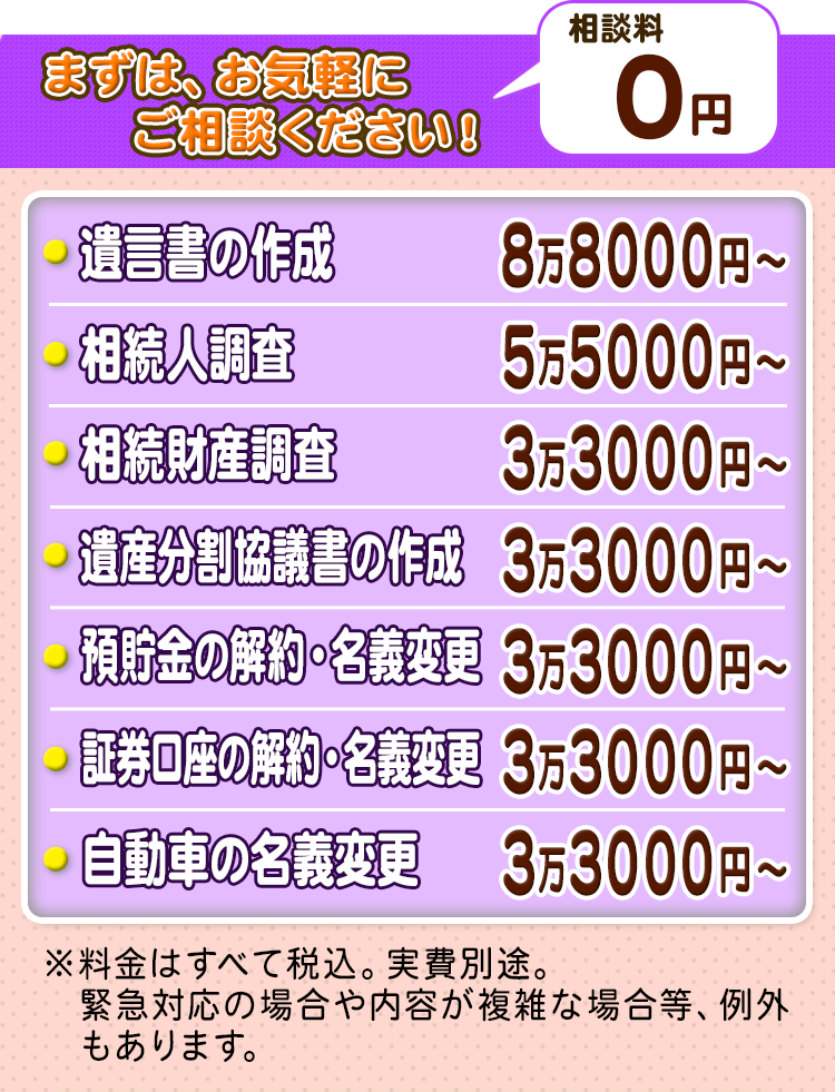 相続手続きといっても、その内容は多岐に渡り、相続人・財産を確定させるための調査や、遺産分割協議書の作成、銀行の預金解約・名義変更、株式の名義変更、自動車の名義変更などがあります。