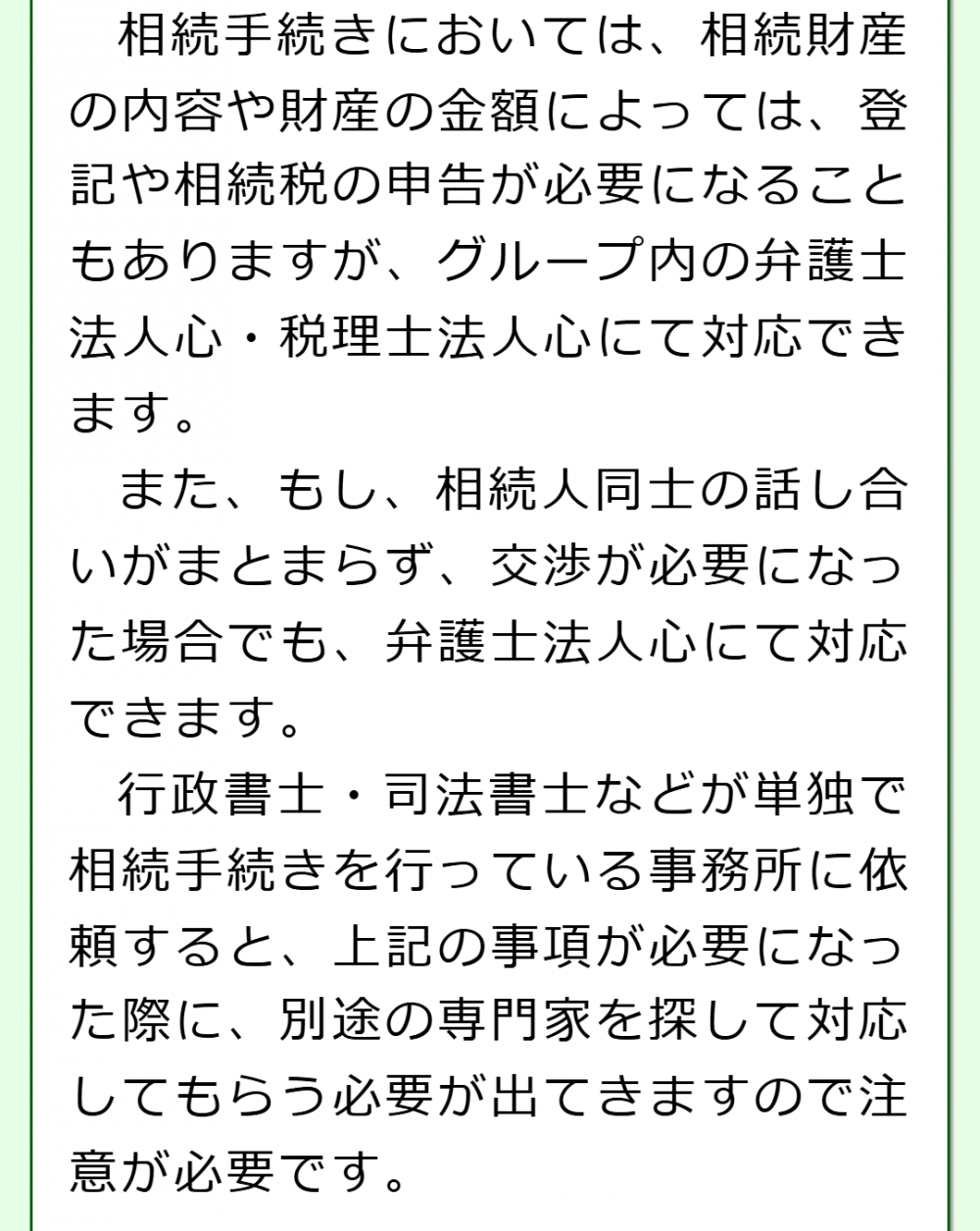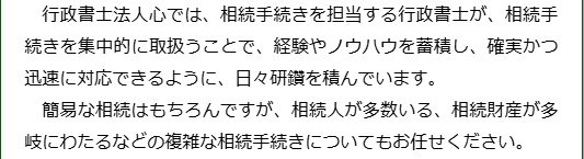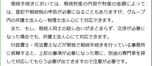 相続手続きを得意とする行政書士が迅速に対応させていただきますし、グループ内の弁護士や税理士と協力して幅広い相続手続きに対応できる体制を整えておりますので、安心してお任せください。