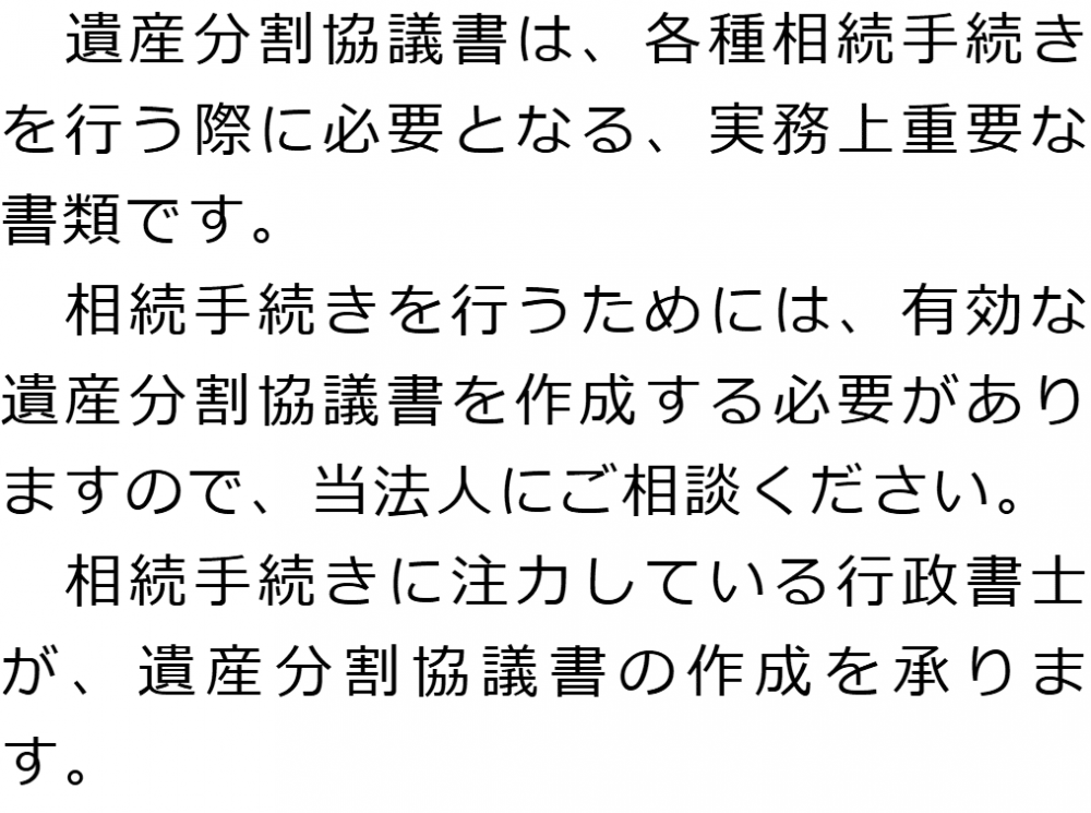 トップ業務内容遺産分割協議書の作成 階層構造▼ 業務内容(目次) 遺産分割協議書の作成 業務内容(目次)業務内容トップ行政書士法人心の業務内容遺言遺産整理相続人調査相続財産調査遺産分割協議書の作成預金・貯金の解約・名義変更証券口座の解約・名義変更自動車の名義変更心グループのその他の業務内容家族信託・民事信託節税対策事業承継遺言の検認相続放棄限定承認遺産分割遺留分侵害額請求相続登記相続税申告相続税調査 受付時間 平日 9時~21時、土日祝 9時~18時 夜間・土日祝の相談も対応します (要予約) 所在地 〒460-0008 愛知県名古屋市中区栄3-16-1松坂屋名古屋店本館7F 0120-2403-39 お問合せ・アクセス・地図