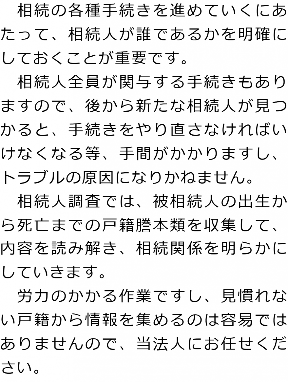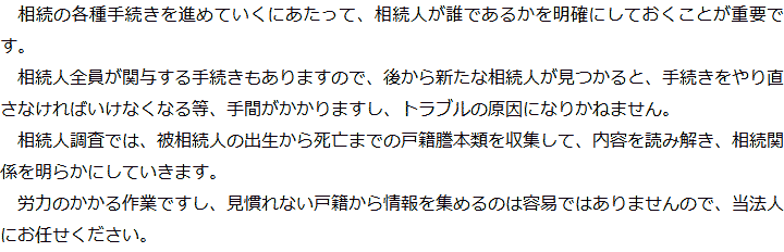 トップ業務内容相続人調査 階層構造▼ 業務内容(目次) 相続人調査 業務内容(目次)業務内容トップ行政書士法人心の業務内容遺言遺産整理相続人調査相続財産調査遺産分割協議書の作成預金・貯金の解約・名義変更証券口座の解約・名義変更自動車の名義変更心グループのその他の業務内容家族信託・民事信託節税対策事業承継遺言の検認相続放棄限定承認遺産分割遺留分侵害額請求相続登記相続税申告相続税調査 受付時間 平日 9時~21時、土日祝 9時~18時 夜間・土日祝の相談も対応します (要予約) 所在地 〒460-0008 愛知県名古屋市中区栄3-16-1松坂屋名古屋店本館7F 0120-2403-39 お問合せ・アクセス・地図