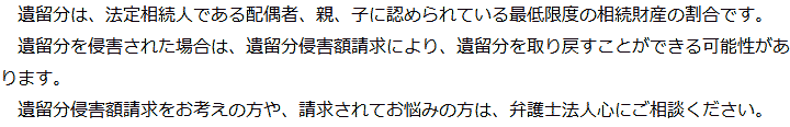 トップ業務内容遺留分侵害額請求 階層構造▼ 業務内容(目次) 遺留分侵害額請求 業務内容(目次)業務内容トップ行政書士法人心の業務内容遺言遺産整理相続人調査相続財産調査遺産分割協議書の作成預金・貯金の解約・名義変更証券口座の解約・名義変更自動車の名義変更心グループのその他の業務内容家族信託・民事信託節税対策事業承継遺言の検認相続放棄限定承認遺産分割遺留分侵害額請求相続登記相続税申告相続税調査 受付時間 平日 9時~21時、土日祝 9時~18時 夜間・土日祝の相談も対応します (要予約) 所在地 〒460-0008 愛知県名古屋市中区栄3-16-1松坂屋名古屋店本館7F 0120-2403-39 お問合せ・アクセス・地図